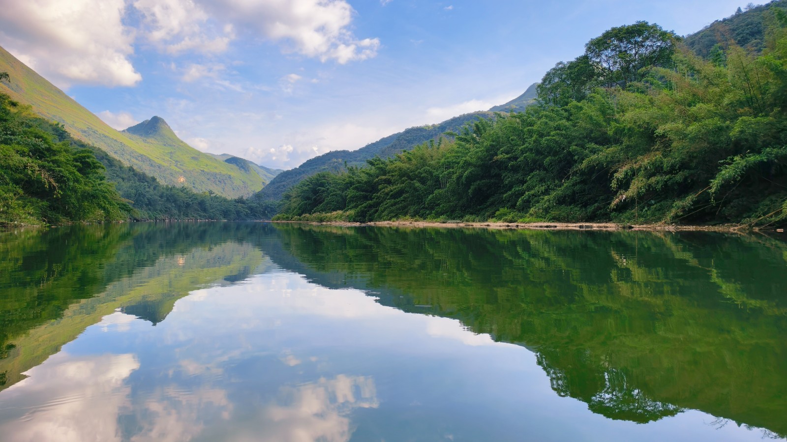 两岸青山连绵起伏,竹林与绿树层层叠叠,