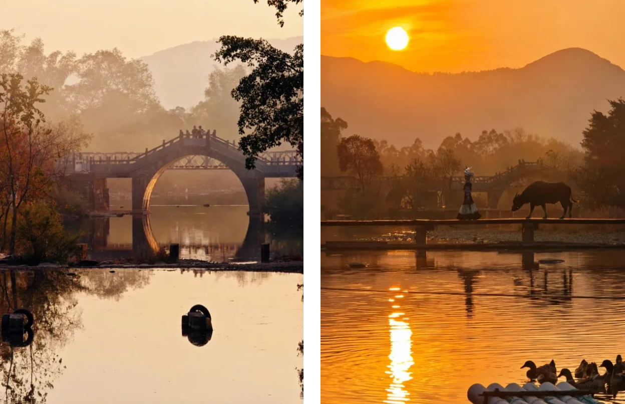 可见两旁古色古香的建筑与漓江畔的桥影相互映衬在阳光的照耀下,美得如诗如画