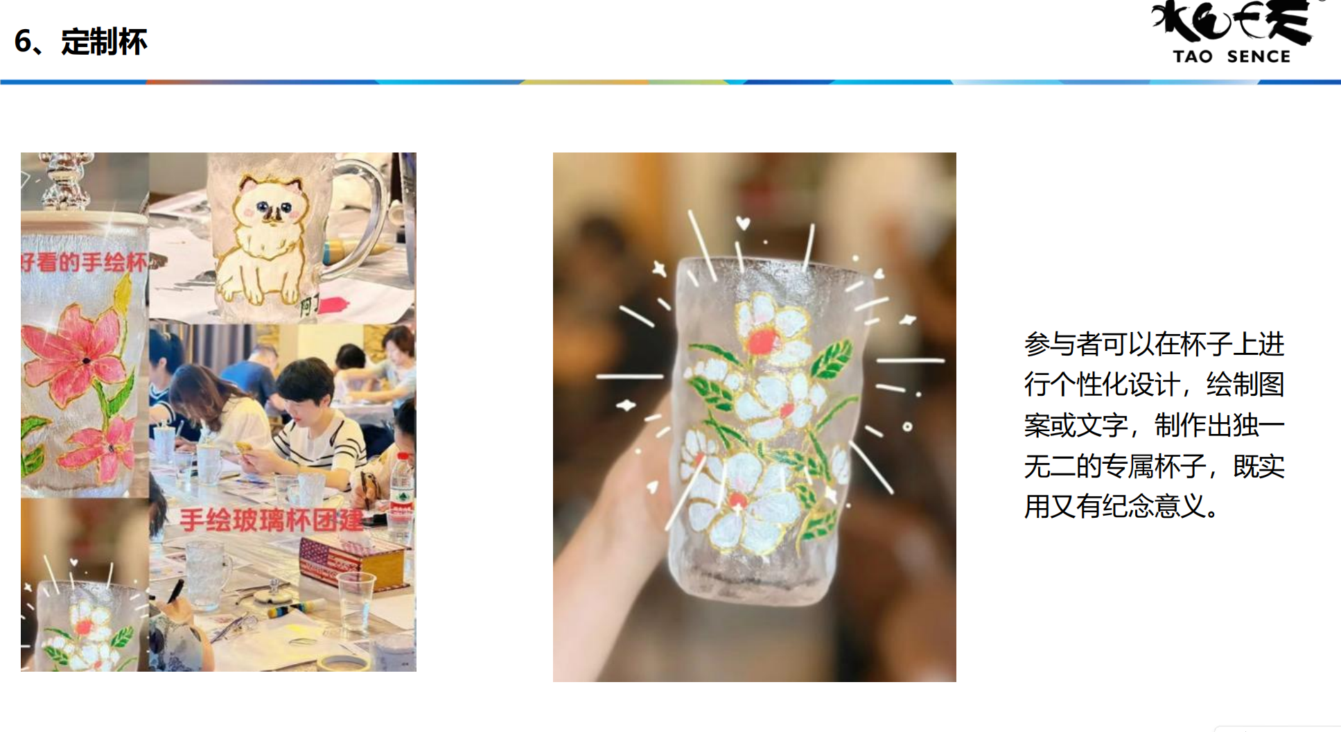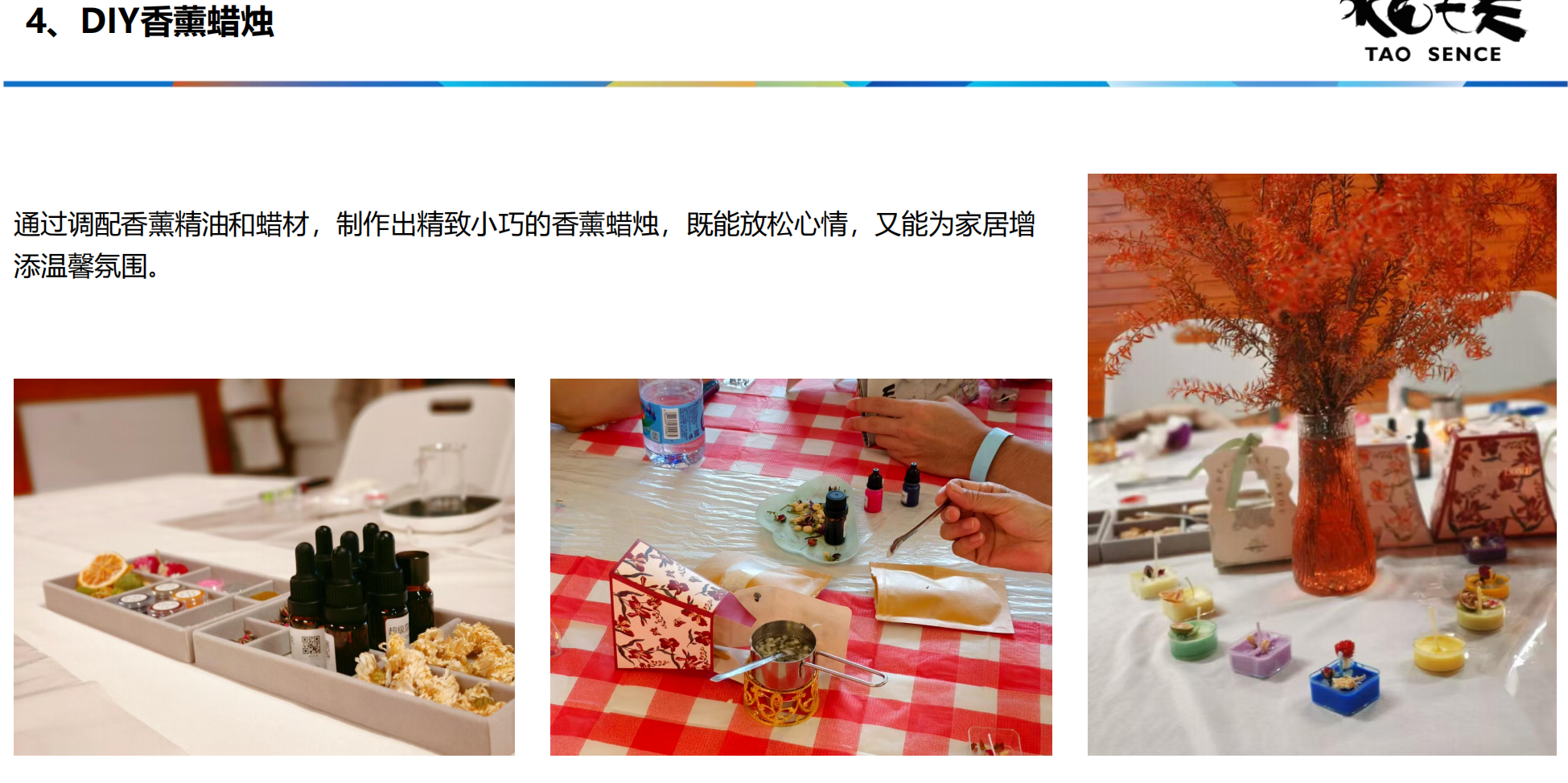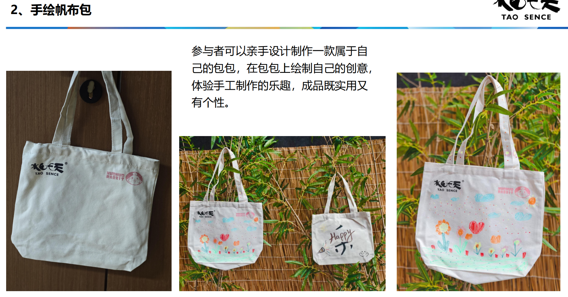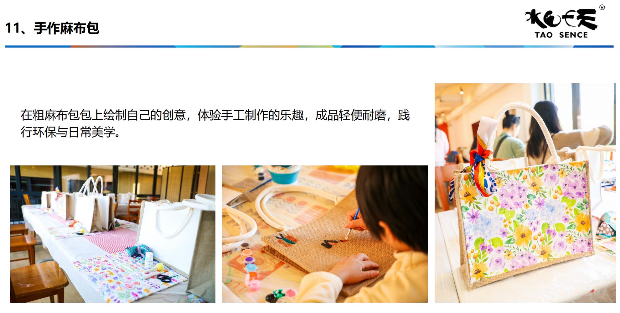 13:30 手工。大家一起体验手工(手绘帆布包、手作麻布包、定制杯、香薰蜡烛、沙画蜡烛、植物拓印选一个)