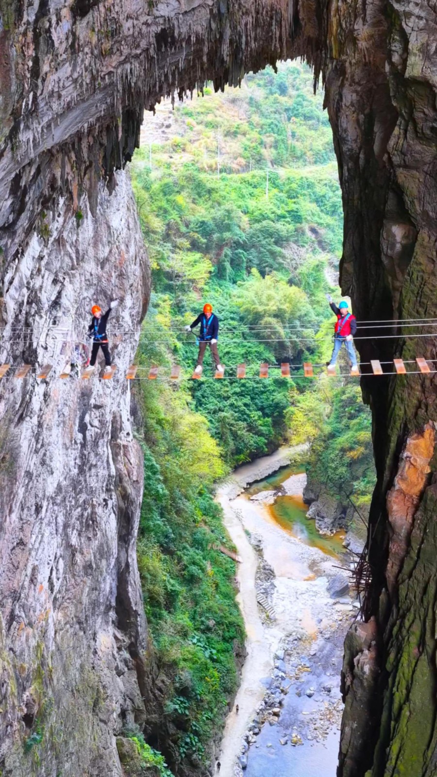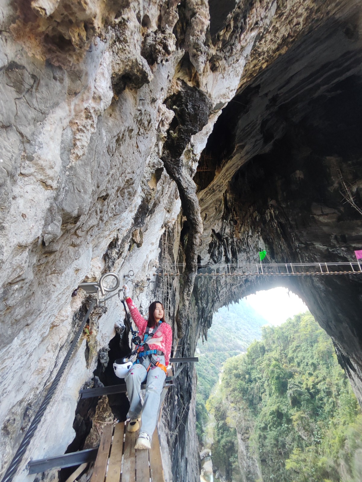10:00:燕窝洞&飞拉达。到达景区,领队买票带领大家徒步探秘燕窝洞,挑战燕窝洞飞拉达和天梯。如果觉得飞达拉不够刺激,想体验大摆荡和蹦极的自费体验。(飞拉达必须身高1.2米以上)
