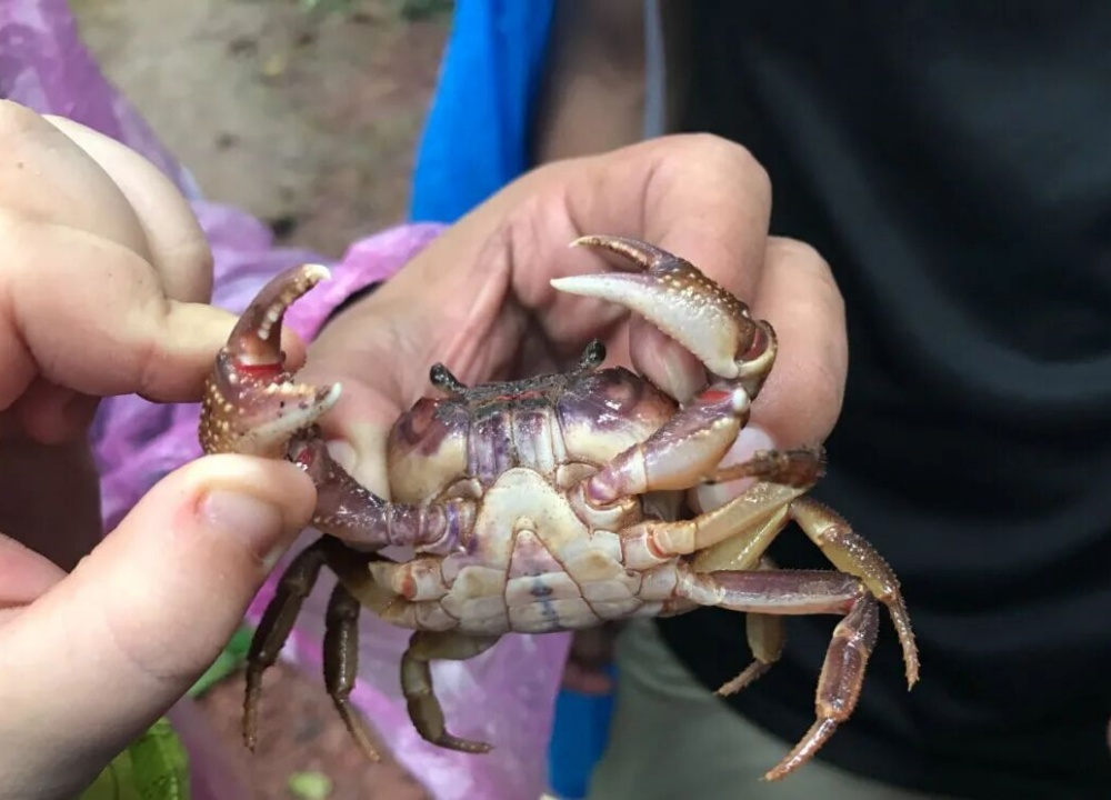 导师带领沿溪流缓行,示范翻动石块的正确手法(双手托举轻放,避免破坏栖息地),发现蟹洞后讲解判断深度与是否有蟹的技巧。