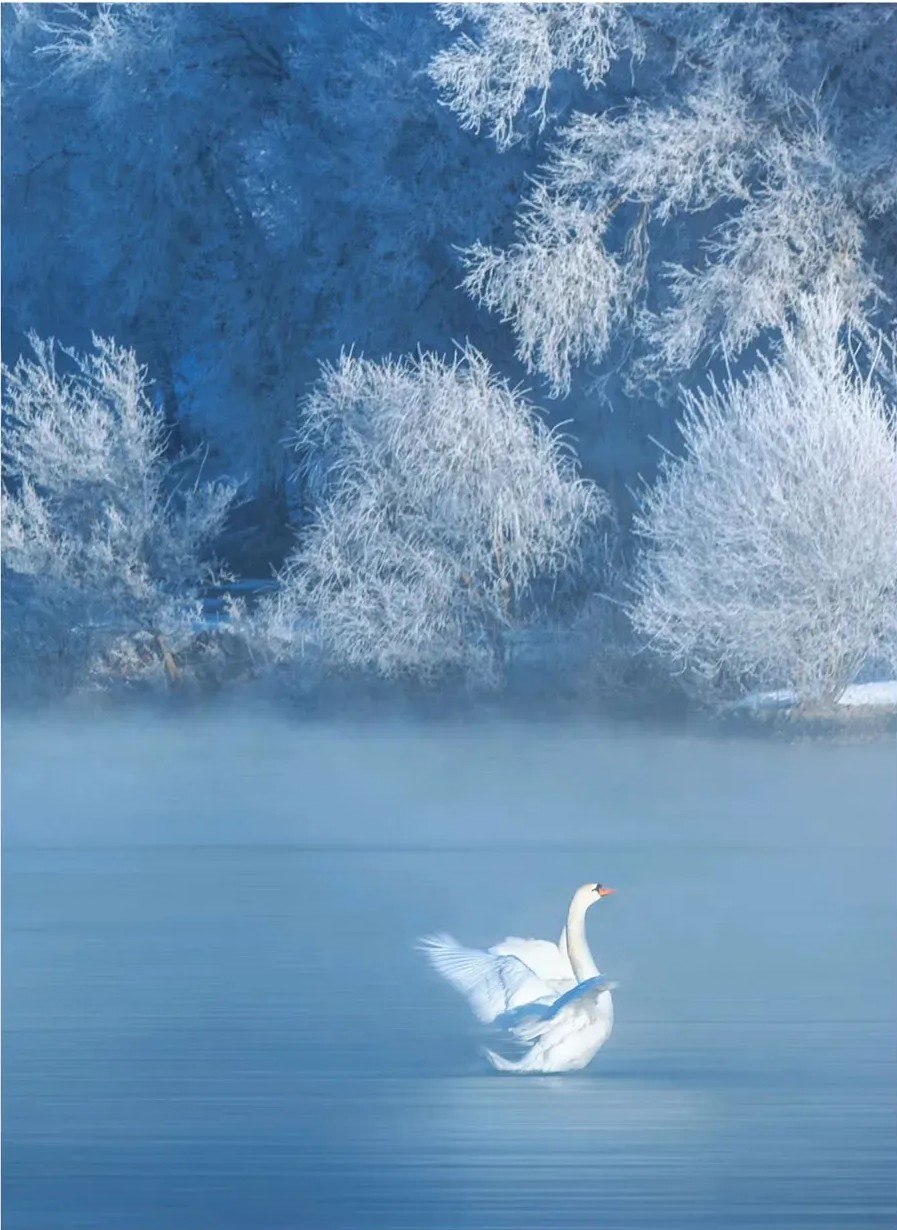 晨雾中的天鹅与雾凇融合在一起,美如仙境