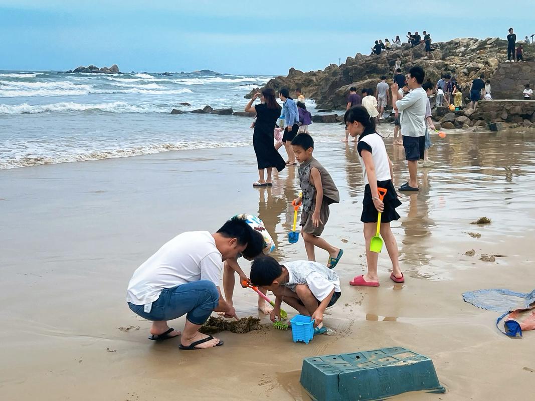 沙子软到可以埋人,坡度平缓小宝宝也能踩水。领队掐着潮汐表带路,发小桶小铲子——挖蛤蜊、抓小螃蟹、找寄居蟹。孩子蹲在那里专注赶海,挖到一只就尖叫。这种“内啡肽”式的快乐,买玩具给不了。