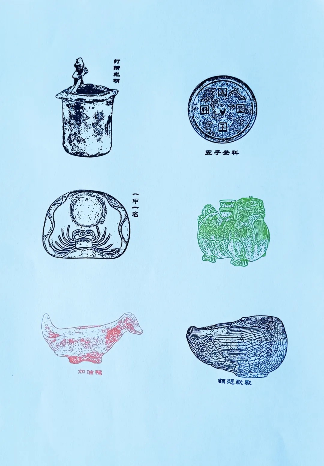 本次新发布的8款文创印章图案(从上至下):“肇庆”,“肇庆府”,“打捞光明”,“五子登科”,“一甲一名”,青瓷狮形水注,“加油鸭”,“额想歇歇”。