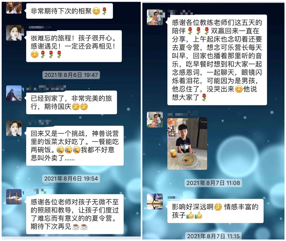 【3】关于想家的孩子:根据我们的经验,基本都为第一天晚上快到睡觉的时候,开始想妈妈,然后第二天基本没事了。但是这个时候,往往也是家长最想知道孩子想不想妈妈的时候,所以建议那些第一次出门的,而你又特别想孩子的,可以通过教练了解孩子的信息,通过打教练的手机给孩子接听。这样容易帮助孩子渡过想家期;