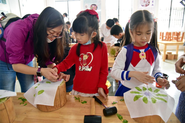 小朋友们用几片叶子花卉、一块棉布、一个锤子、一个木墩