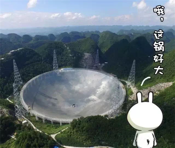 世界上最大的“天坑”之一(最大的那个在它旁边)。而经过22年的建造,总造价6.67亿,这个天坑建起了具有我国自主知识产权、世界上单口径最大、最灵敏的射电望远镜——FAST!(下面这口锅就是啦)。